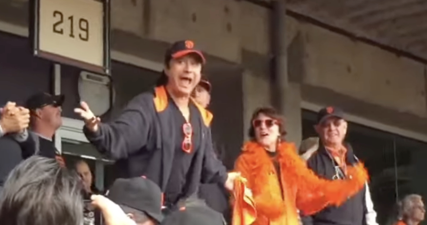 Steve Perry leading the crowd to sing Journey’s “Don’t Stop Believin'” at a 2014 San Francisco Giants game.
