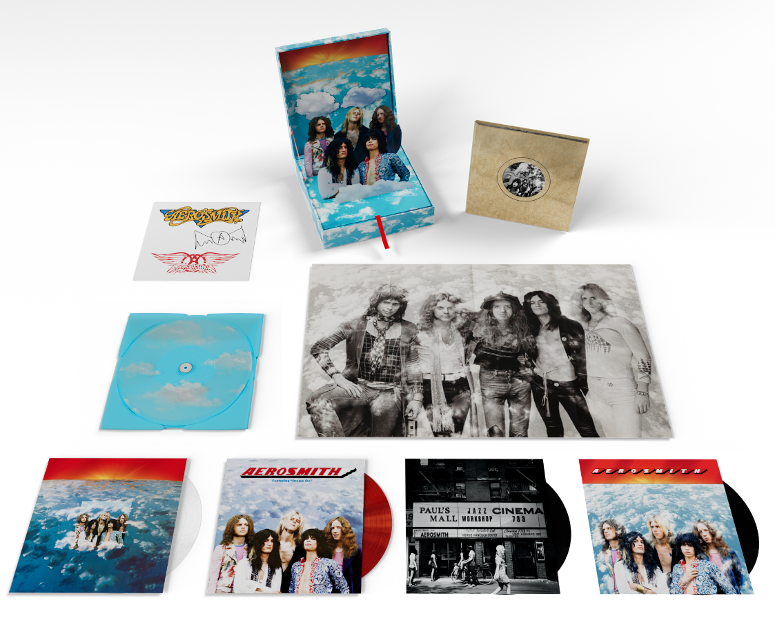 The 5-LP set boasts the original album remastered on 180g clear vinyl, the 2024 album mix pressed on 180g translucent red vinyl, a highly sought-after live performance from Paul’s Mall back in 1973 on 180g vinyl, a host of recently unearthed and unheard studio tracks on 180g vinyl, and an exclusive clear UV cloud-effect 12” vinyl with “Dream On” (2024 Remaster) and “Dream On” (2024 Mix) placed atop a printed sky-blue slipmat. With creative direction and iconic images by renowned photographer Ross Halfin, the package documents the genesis of Aerosmith with a very special hardback book featuring never-before-seen photos. Penned by author and veteran music writer Rick Florino, the liner notes tell the story of Aerosmith in the band’s own words with new interviews with all five original members as well as perspectives, thoughts, and adoration from fellow rockers. The package also features an exclusive fold-out 24” by 36” poster and sticker sheet. The box itself unfolds into a 3D Aerosmith popup Diorama.