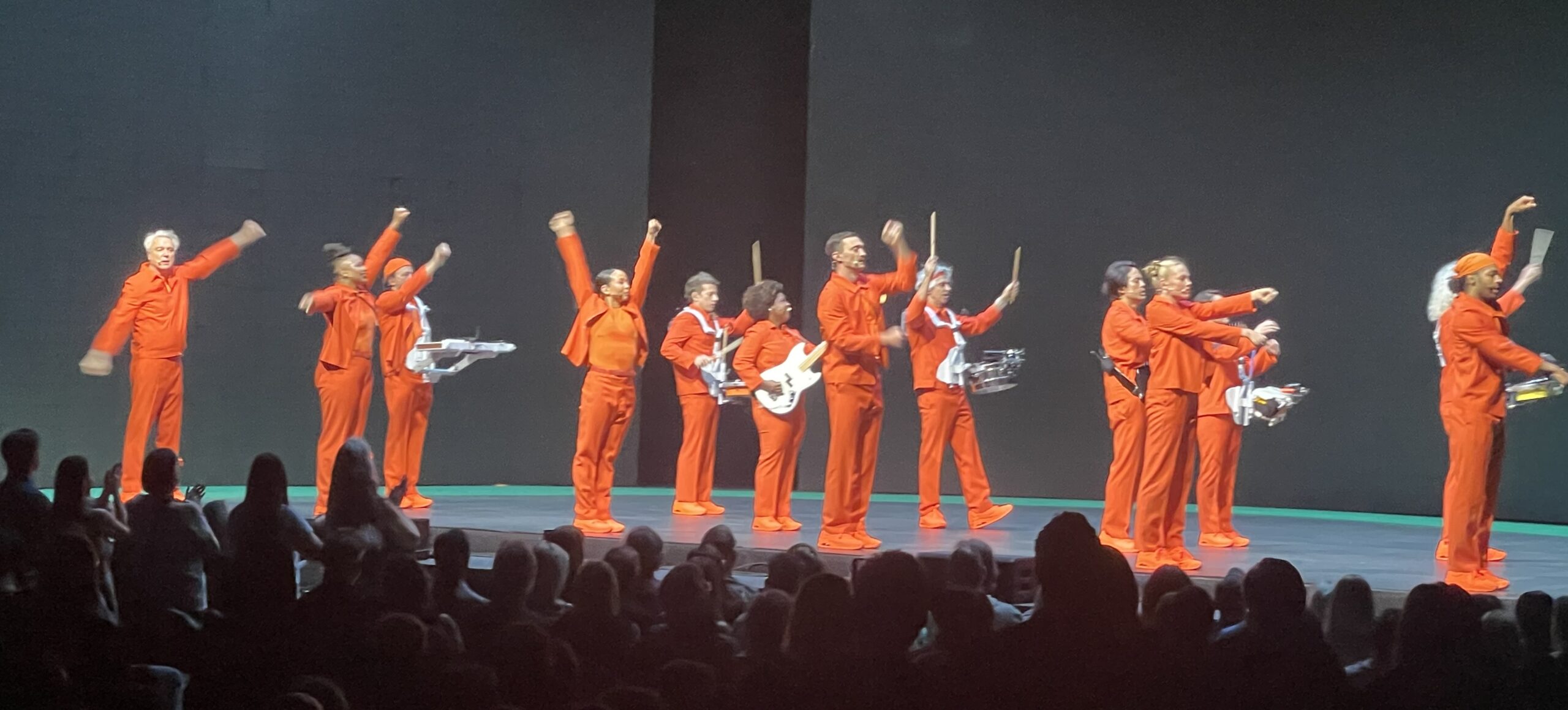 Byrne is joined on stage by a dozen band members and as with the “American Utopia” show, they’re all in matching monochromatic outfits (for this show, they were dressed in orange). All of the musicians’ instruments are on straps hung on the performers’ necks, which allows them to freely move about the stage in well-choreographed precision. That includes, at times, four percussionists, as well as keyboards, and, of course, guitars and bass. The presentation features a wraparound screen that provides provocative messages as well as recent street footage, mostly from New York City. It combines for an audio and visual delight.